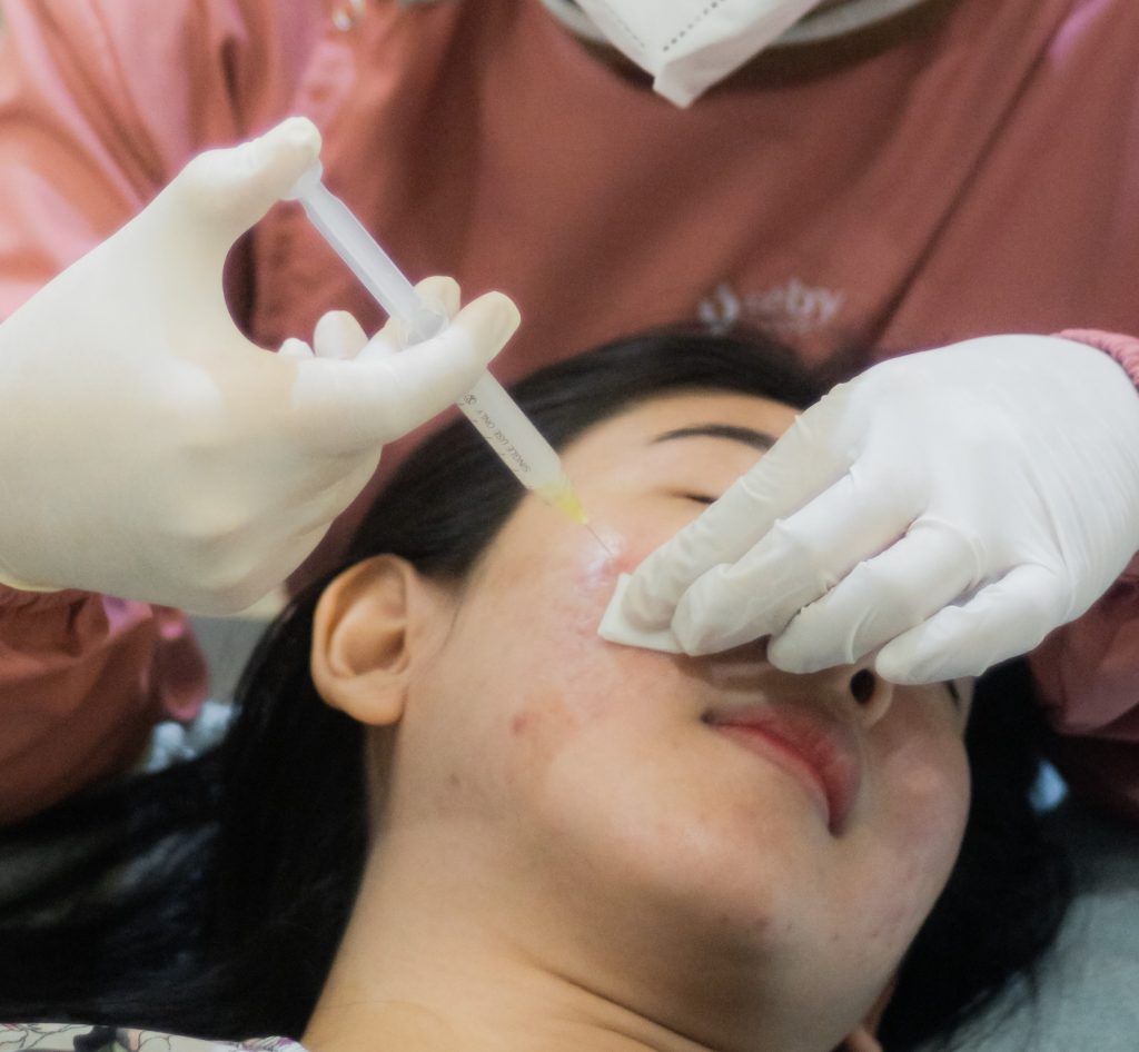 Tindakan memasukkan cairan obat khusus melalui suntikan ke area jerawat. Tindakan ini diperlukan untuk melengkapi teknik ekstraksi pada kondisi jerawat tingkat sedang dan berat. Sangat efektif untuk mempercepat proses penyembuhan jerawat.